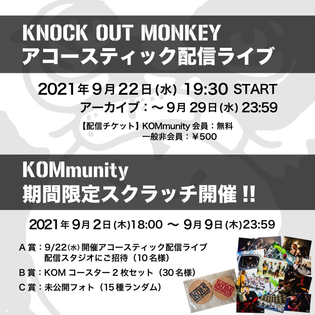 KNOCK OUT MONKEYオフィシャルファンコミュニティ「KOMmunity」にてアコースティック配信ライブ開催!!