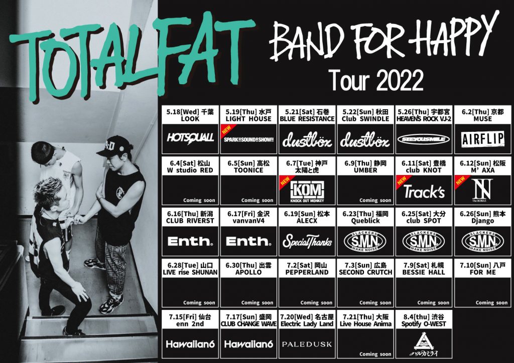 2022/06/07(火) @MUSIC ZOO KOBE 太陽と虎(兵庫県)TOTALFAT『BAND FOR HAPPY Tour 2022』 TOTALFAT『BAND FOR HAPPY Tour 2022』 【Date】 2022年6月7日(火) 【Place】 MUSIC ZOO KOBE 太陽と虎(兵庫県) 【Time】 open 18:00 / start 18:30 【Act】 TOTALFATKNOCK OUT MONKEY 【Ticket】 ¥4,200(D代別途)